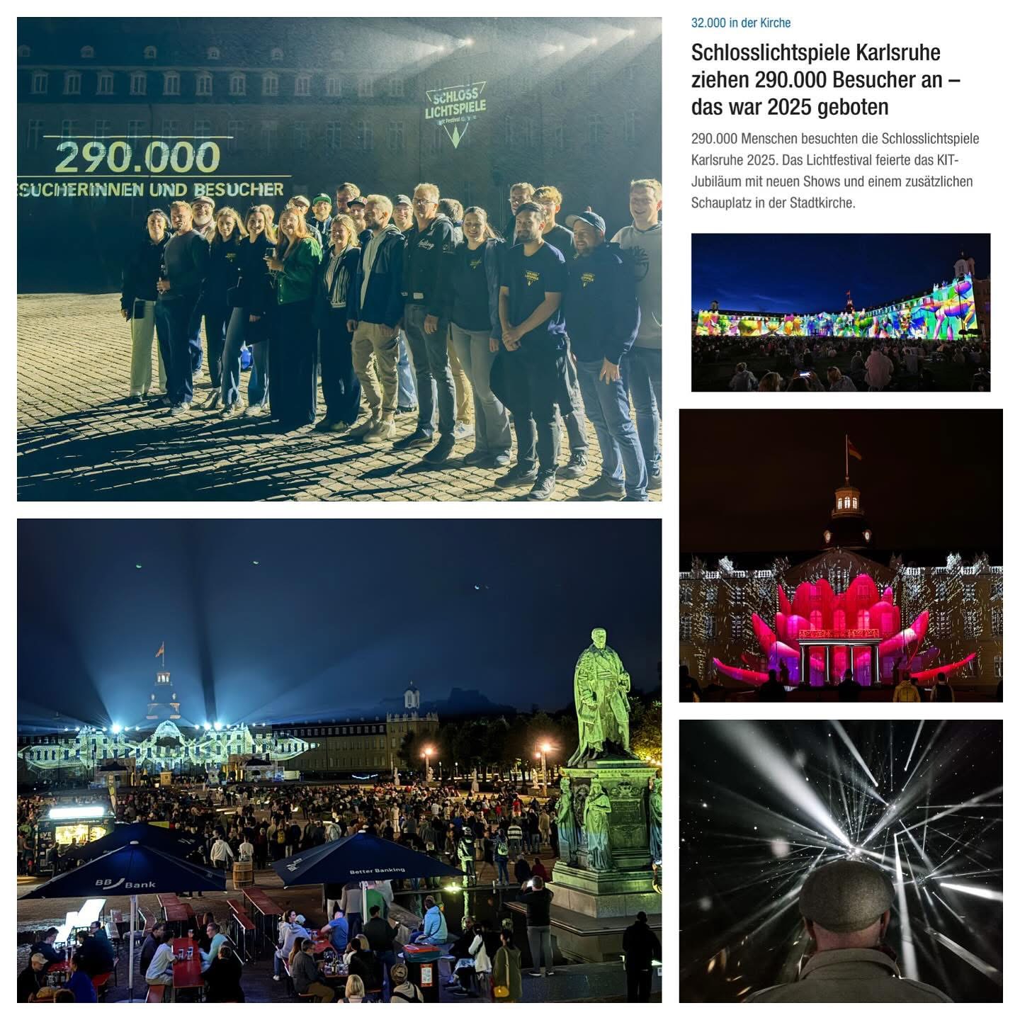 Was für eine starke Bilanz nach viereinhalb Wochen SCHLOSSLICHTSPIELE LIGHT FESTIVAL: erneut fast 300.000 auf dem Schlossplatz, dazu über 30.000 in der evangelischen Stadtkirche, neue, starke Bilder auf der Fassade und eine allabendliche Belebung der Innenstadt – verbunden mit dem am Ende stabilen Wetter bin ich voller Dankbarkeit für unsere elfte Spielzeit. Besonders freut mich, dass wir neben den treuen Sponsoren mit dem neuen Freundeskreis weitere Unterstützung für dieses eintrittsfreie Kunst-Ereignis bekommen haben. Die regionale und überregionale Berichterstattung war erneut herausragend, vom Morgenmagazin bis zum Kunst- Magazin monopol, ich zitiere: „Kunst mit Public Viewing-Atmosphäre!“ Gestern Abend konnten wir zum Abschluss mit dem gesamten Team feiern, ich danke für die herausragende Kooperation dem Zkm, dem Kulturbüro der Stadt und natürlich unserem fantastischen Team der KME! Wir haben die Stadt zum Strahlen gebracht!